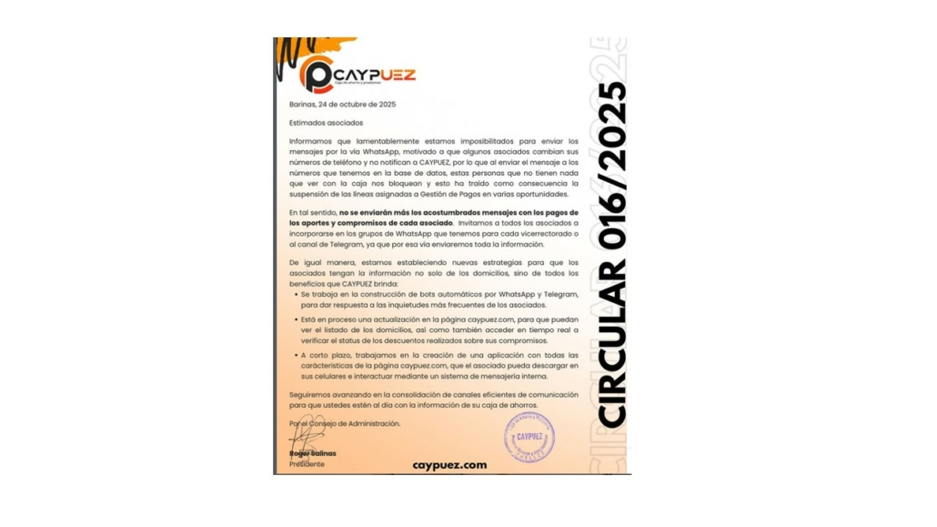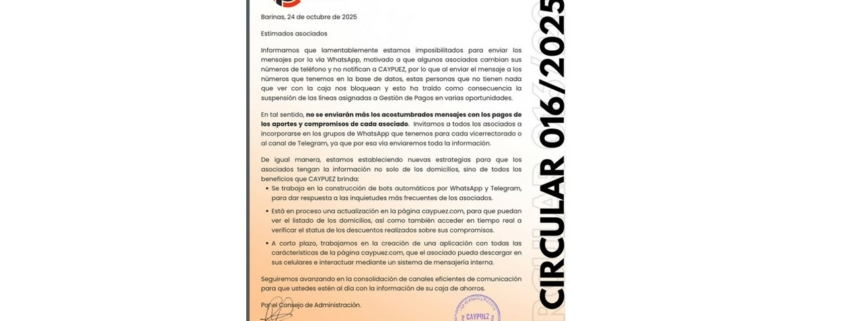 • #CAYPUEZinforma | Circular 016/2025: No se enviarán más los acostumbrados mensajes con los pagos de los aportes y compromisos de cada asociado, estamos en la búsqueda de opciones que nos permitan resolver esta situación, sin embargo, responsablemente anunciamos que por el momento no se enviarán más estos mensajes.